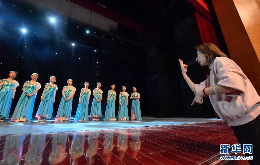 在天津理工大學(xué)的劇場(chǎng)里,天津市殘疾人文藝體育訓(xùn)練指導(dǎo)中心舞蹈老師韓菲在用手語(yǔ)為學(xué)生們指導(dǎo)(5月10日攝)。新華社發(fā)(孫凡越攝)