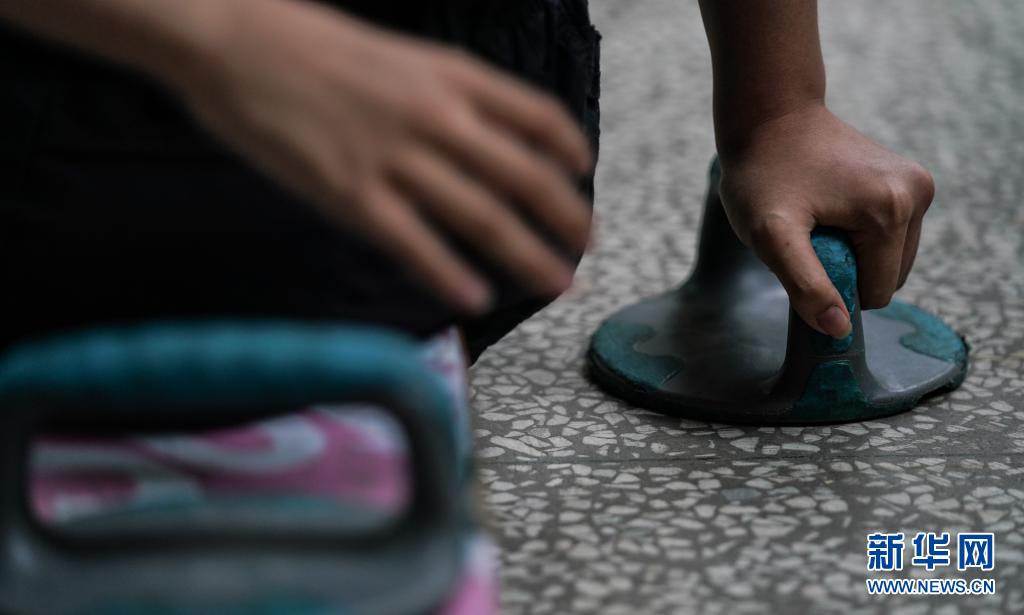 2021年5月10日,蔣張子怡借助滑板和吸盤在學(xué)校內(nèi)穿行。