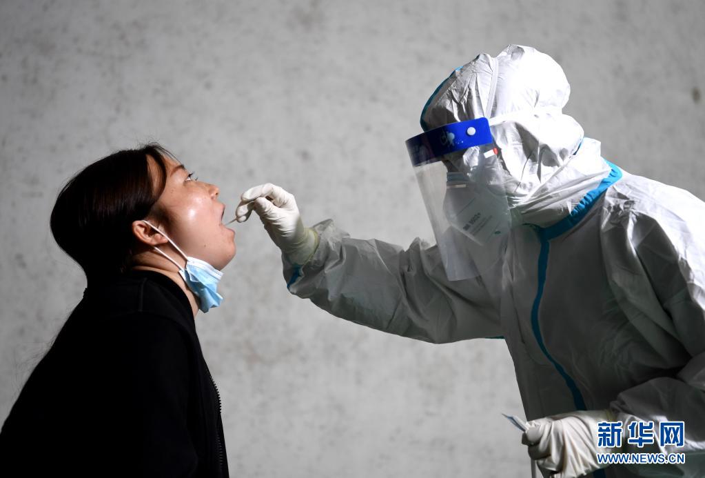 5月16日晚,在肥西縣上派鎮(zhèn)一小區(qū),工作人員為居民進行核酸采樣。
