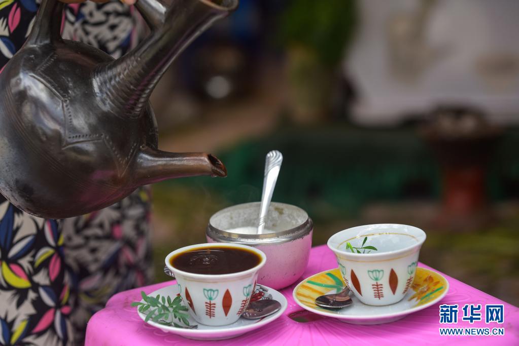5月14日,商販在埃塞俄比亞亞的斯亞貝巴街頭的咖啡攤為顧客倒咖啡。
