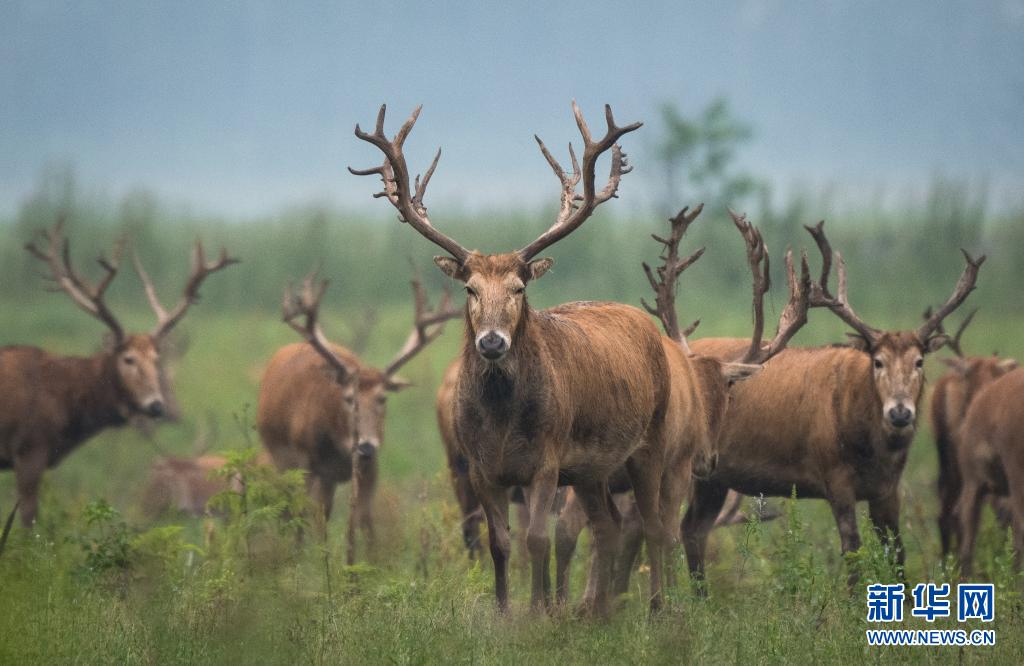 5月17日,一群麋鹿在石首麋鹿國家級自然保護區(qū)內活動。