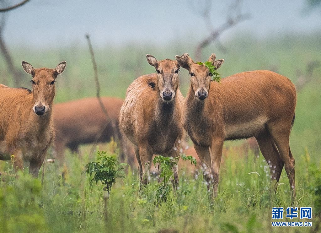 5月17日,一群麋鹿在石首麋鹿國家級自然保護區(qū)內(nèi)活動。新華社記者 肖藝九 攝