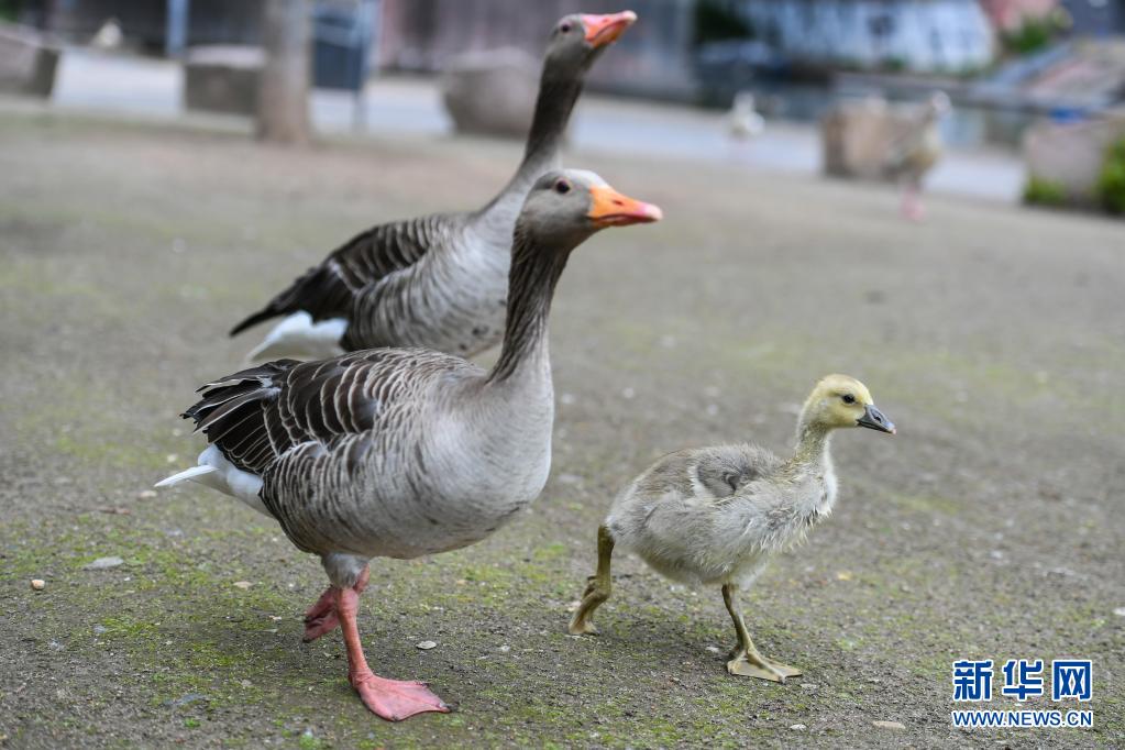 5月19日,幾只灰雁在德國(guó)法蘭克福的美茵河畔覓食。