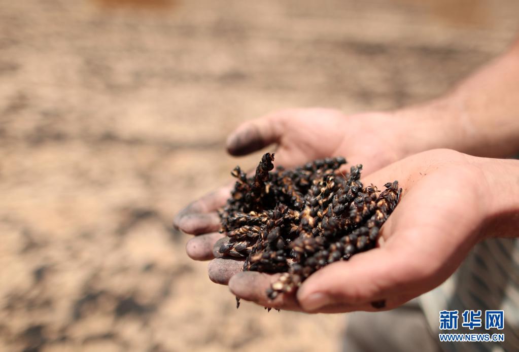 5月22日,在加沙地帶汗尤尼斯,巴勒斯坦農(nóng)民手捧被以色列炮擊燒焦的麥子。新華社發(fā)(亞西爾攝)