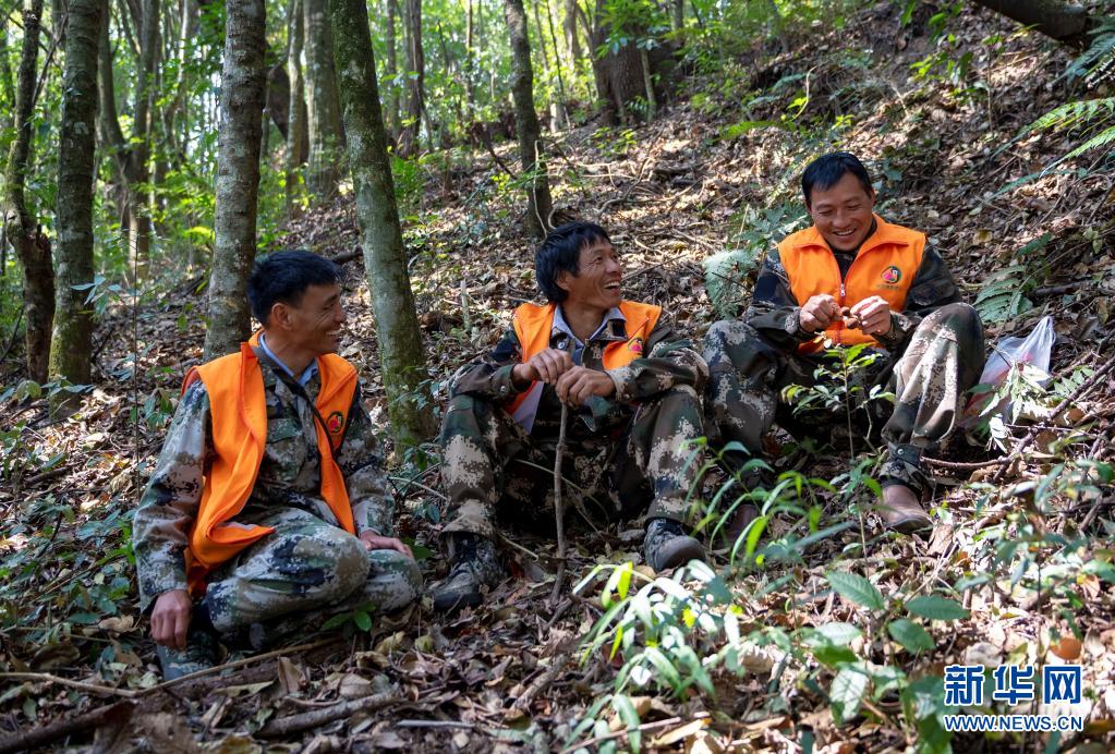 護(hù)林員楊有山(左)和同事巡護(hù)期間在林中休息(3月15日攝)。