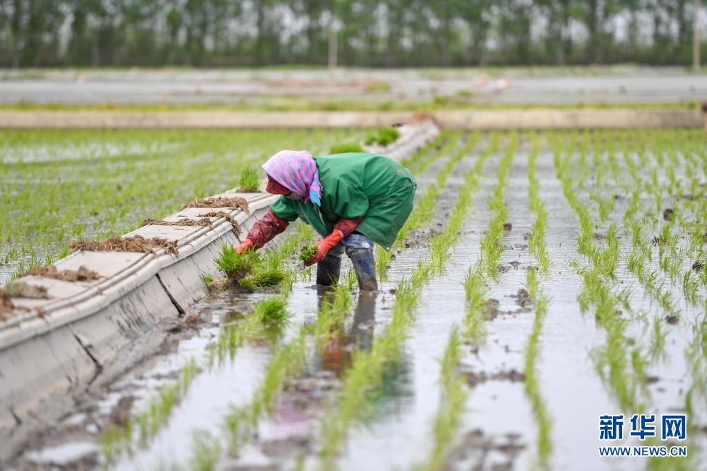 5月26日,在吉林省吉林市永吉縣萬昌鎮(zhèn)宇豐米業(yè)2萬畝高標(biāo)準(zhǔn)水田基地,農(nóng)民進行水稻補苗工作。