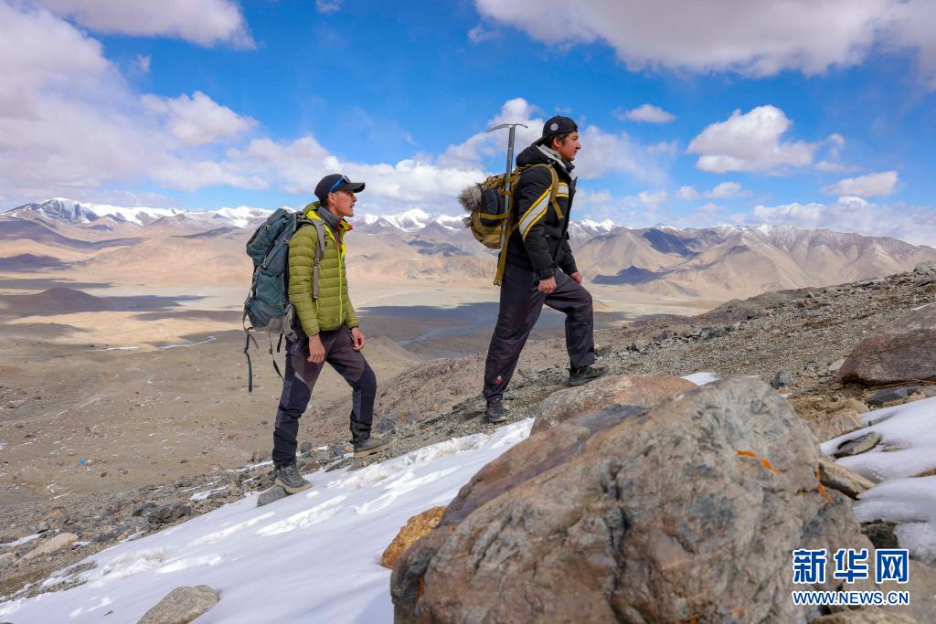 別克米爾扎·圖爾達力(前)和同伴庫爾班巴依·努爾麥麥提行走在山間,準備進行適應(yīng)性練習(xí)(5月15日攝)。每年登山季到來前,他們會選擇天氣晴好時進行訓(xùn)練,適應(yīng)環(huán)境。新華社記者 胡虎虎 攝