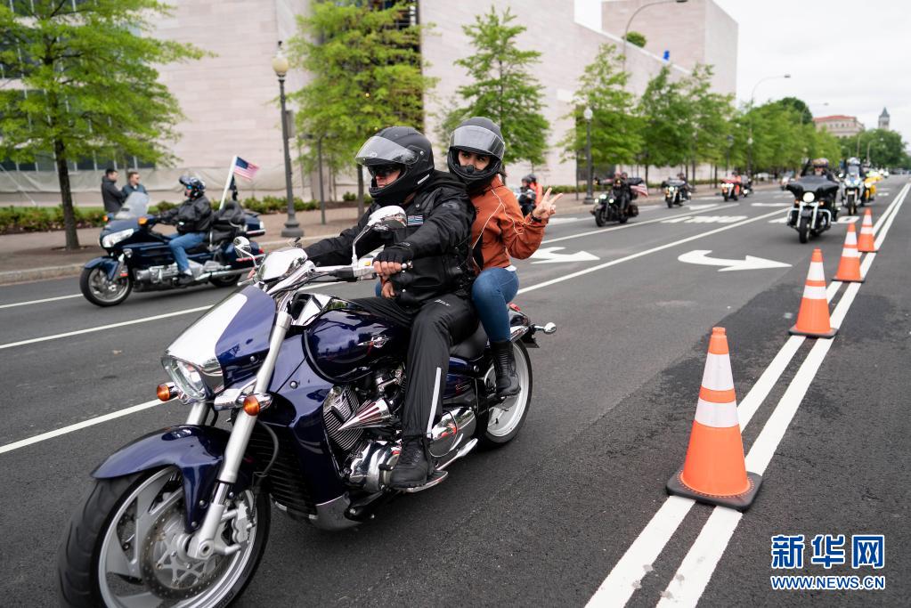 5月30日,在美國(guó)首都華盛頓,參加“滾雷”摩托車(chē)大游行的車(chē)輛駛過(guò)街頭。