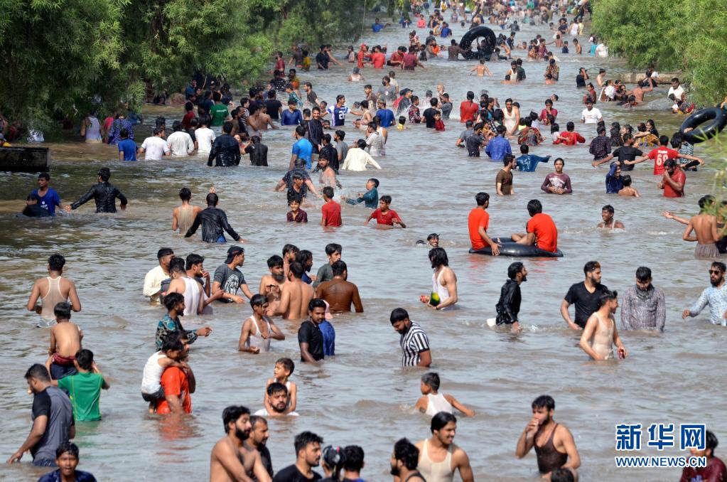 5月30日,人們在巴基斯坦城市拉合爾的溝渠渠水中享受清涼。