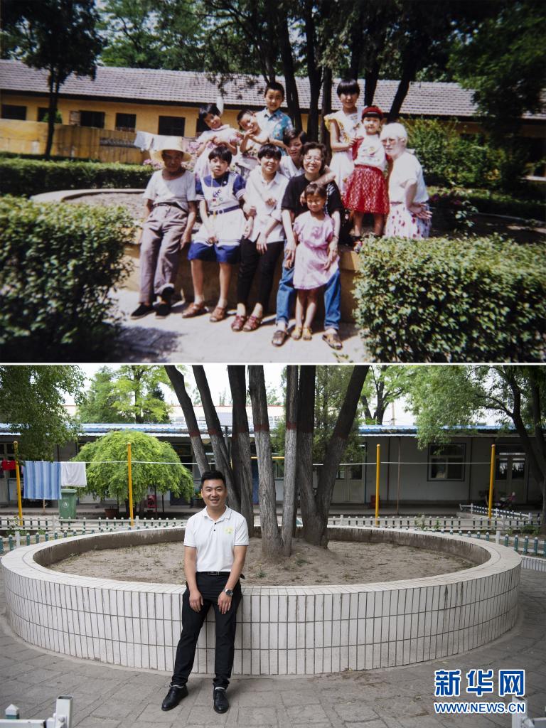 這是一張拼版照片,上圖為:童年時(shí)期的黨龍祥(后排左二)在太原市社會(huì)(兒童)福利院留影(資料照片,受訪者供圖);下圖為:5月31日黨龍祥在太原市社會(huì)(兒童)福利院留影(新華社記者楊晨光攝)。