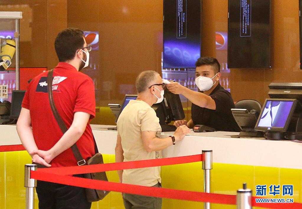 6月2日,一名男子在黎巴嫩貝魯特的一家電影院接受體溫檢測(cè)。