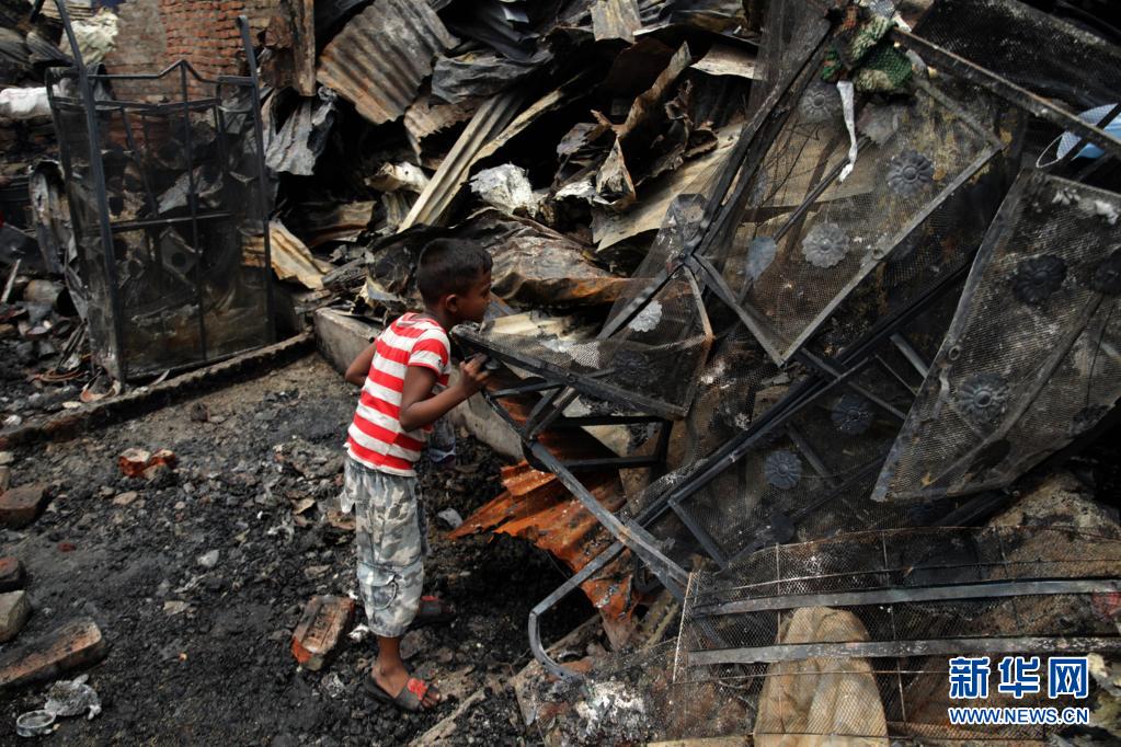 6月7日,一名兒童在孟加拉國首都達(dá)卡發(fā)生火災(zāi)的貧民窟廢墟中尋找個人物品。