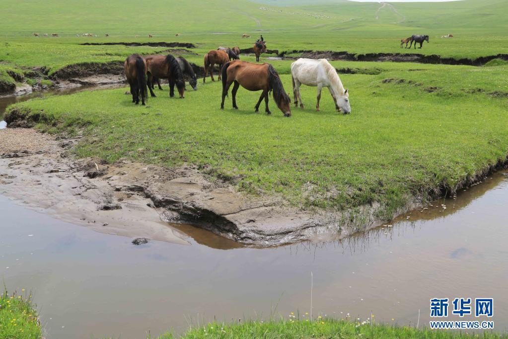 6月8日,牲畜在甘肅省定西市岷縣境內(nèi)的狼渡草原上吃草。