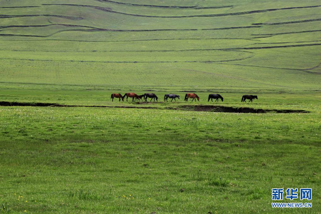 6月8日,馬匹在甘肅省定西市岷縣境內(nèi)的狼渡草原上吃草。