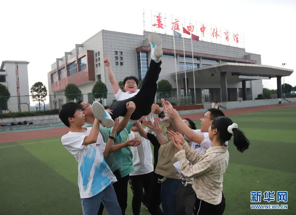 6月9日,在湖南省婁底市第四中學(xué),老三李慶民被同學(xué)們拋向空中,慶祝順利完成高考。