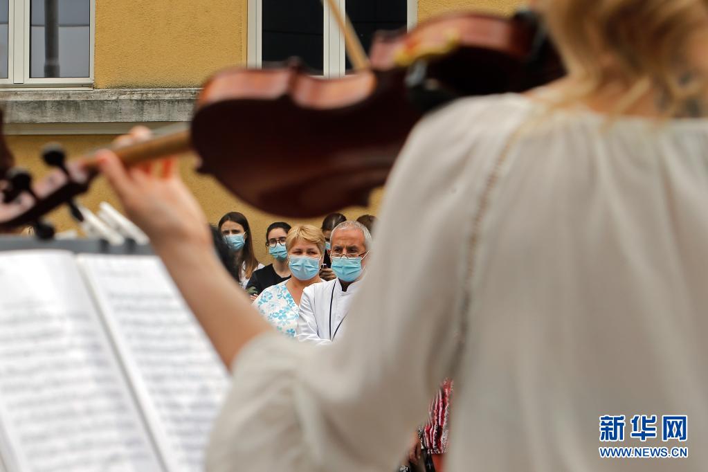 當(dāng)日,羅馬尼亞首都布加勒斯特一個樂隊在該國一家傳染病醫(yī)院——馬太·巴爾什醫(yī)院演出,向抗擊新冠疫情的醫(yī)務(wù)工作者致謝。