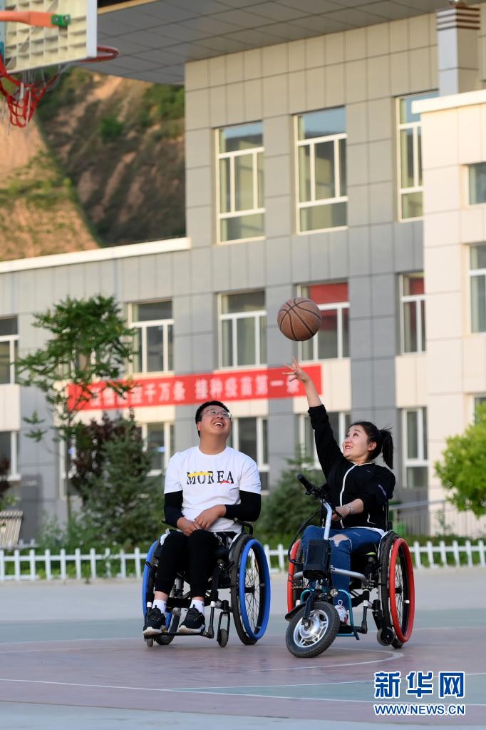 在山西省呂梁市石樓縣體育中心,周海云(左)和關(guān)美坐著輪椅打籃球(6月1日攝)。新華社發(fā)(劉亮亮攝)