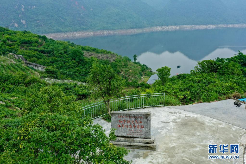 紅軍搶渡烏江江界河戰(zhàn)斗遺址紀(jì)念碑(5月20日攝,無(wú)人機(jī)照片)。新華社記者 歐東衢 攝