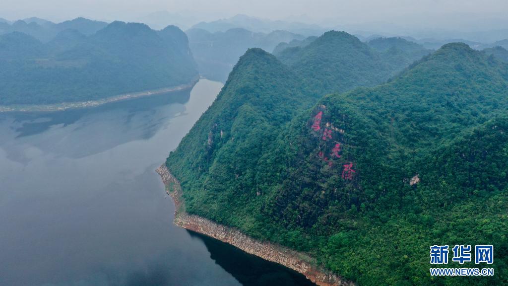 江界河“烏江天險(xiǎn)”石刻(5月20日攝,無人機(jī)照片)。新華社記者 歐東衢 攝