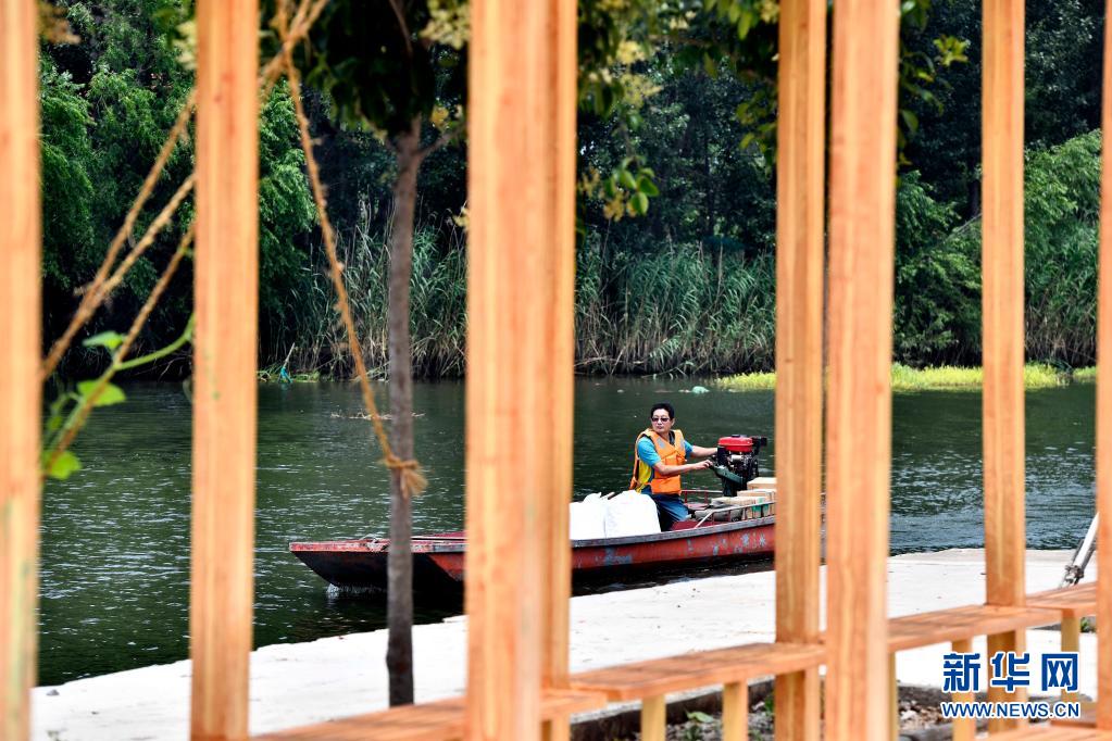 6月20日,在微山縣南陽鎮(zhèn),郵遞員王少朋駕駛郵船為柳溝村村民投遞郵件。