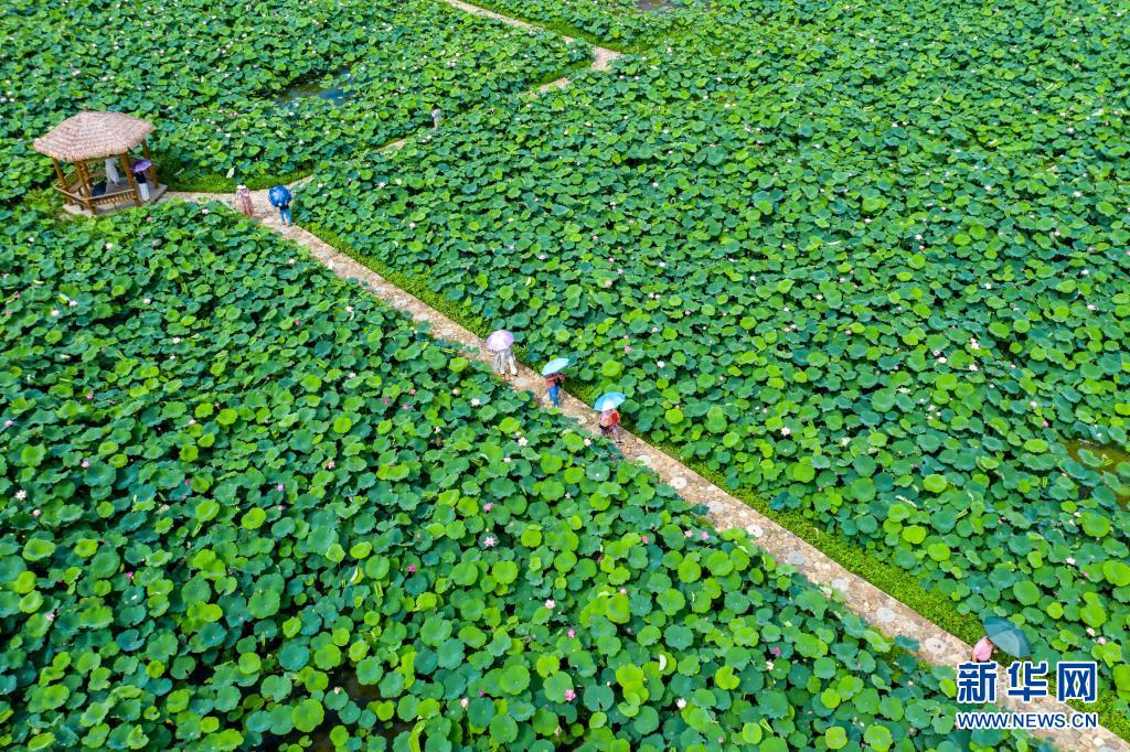 6月21日,在浙江省湖州市長(zhǎng)興縣李家巷鎮(zhèn)石泉村歷史文化古村落,游客賞荷游玩(無人機(jī)照片)。