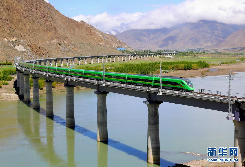 試運(yùn)行的復(fù)興號(hào)列車(chē)行駛在桑日縣境內(nèi)(6月8日攝)。