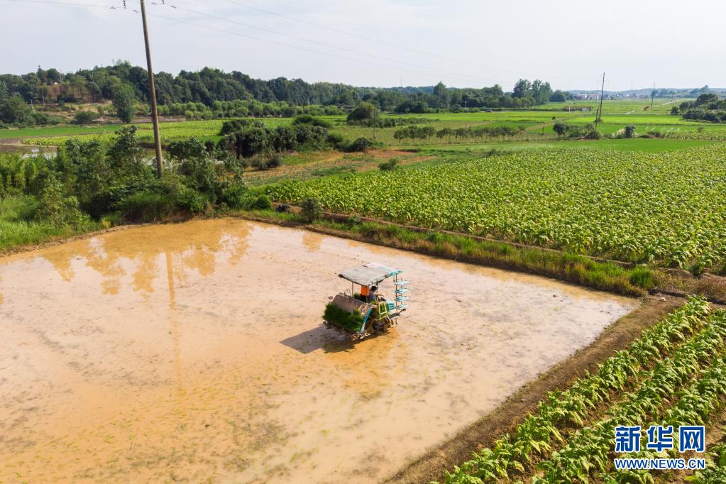 6月26日,湖南瀏陽龍伏鎮(zhèn)新開村村民駕駛插秧機在田間插秧(無人機照片)。