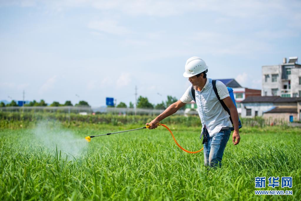 6月26日,湖南瀏陽龍伏鎮(zhèn)新開村村民在田間打藥。