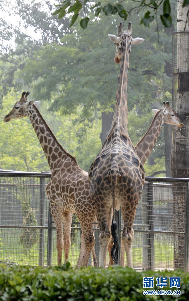 北京動(dòng)物園的長(zhǎng)頸鹿在樹(shù)下乘涼(6月28日攝)。