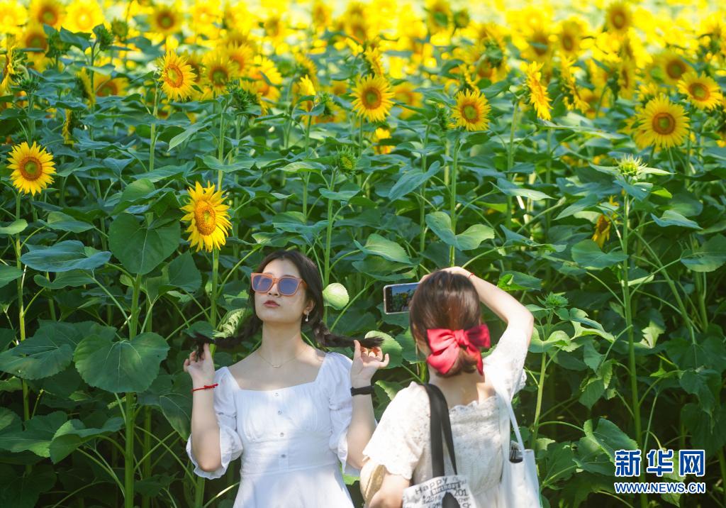 7月4日,游客在北京奧林匹克森林公園北園的向日葵花田旁拍照。