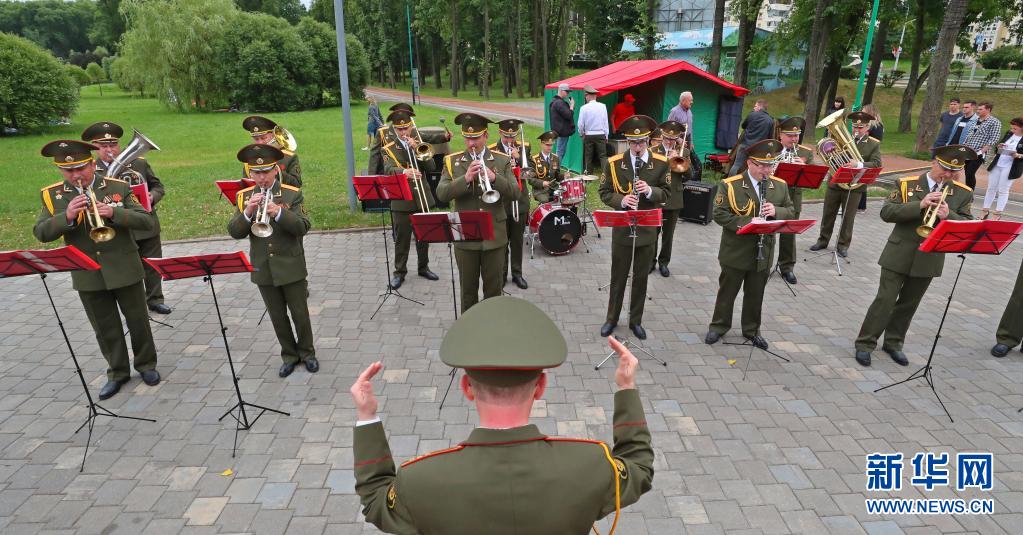7月3日,軍樂隊(duì)在白俄羅斯首都明斯克街頭演奏樂曲。