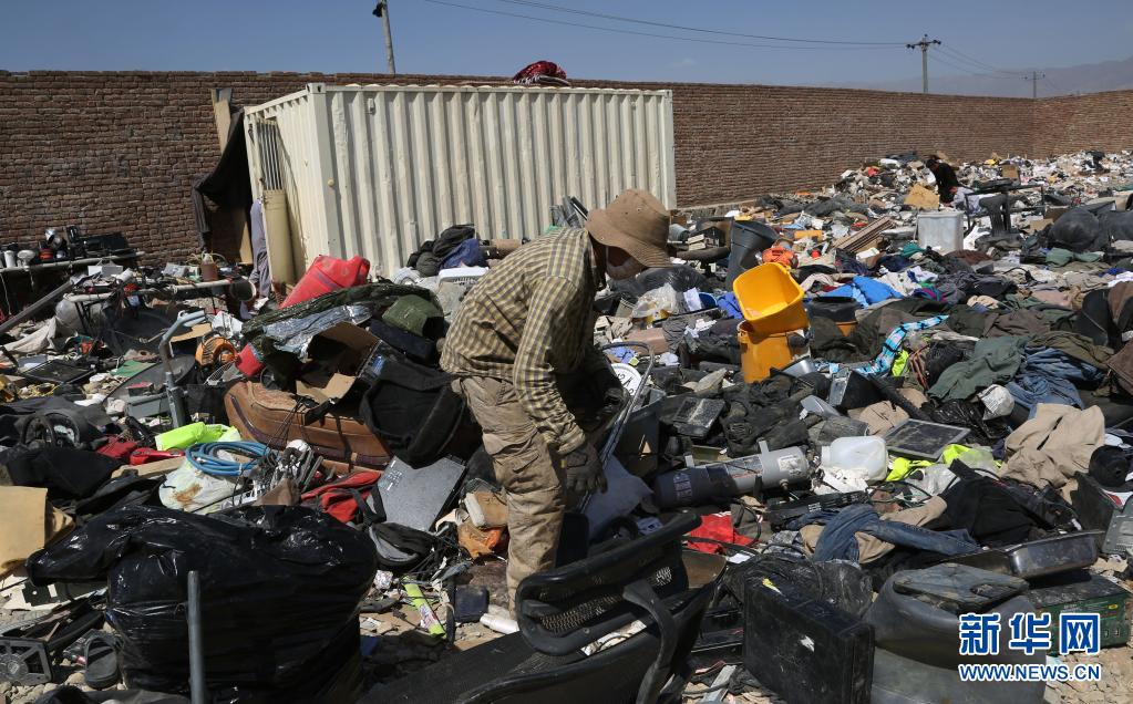 7月3日,在阿富汗帕爾萬省的巴格拉姆空軍基地附近,當?shù)鼐用裨诿儡娺z留下的物品中回收廢舊物。