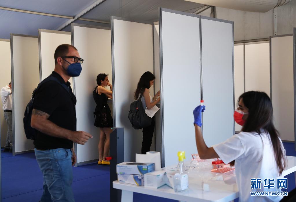 7月5日,在法國戛納為電影節(jié)注冊(cè)人員設(shè)立的新冠病毒檢測(cè)點(diǎn),工作人員收集檢測(cè)樣本。
