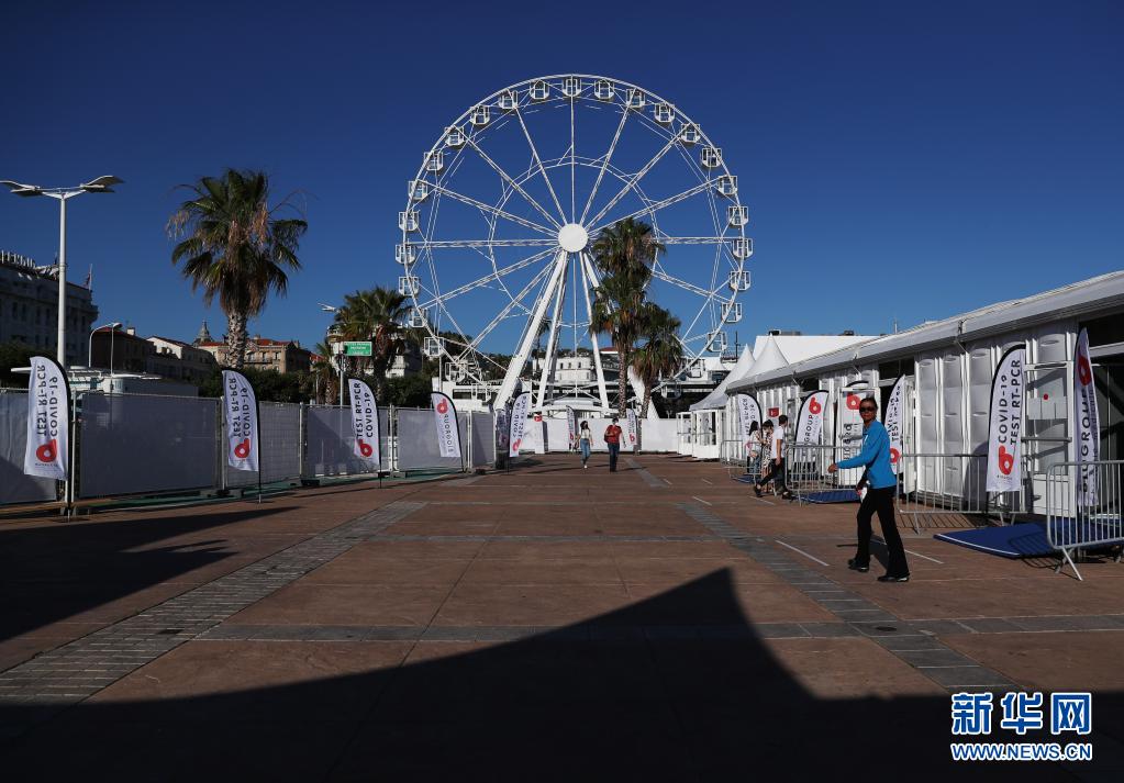 這是7月5日在法國(guó)戛納拍攝的為電影節(jié)注冊(cè)人員設(shè)立的新冠病毒檢測(cè)點(diǎn)。