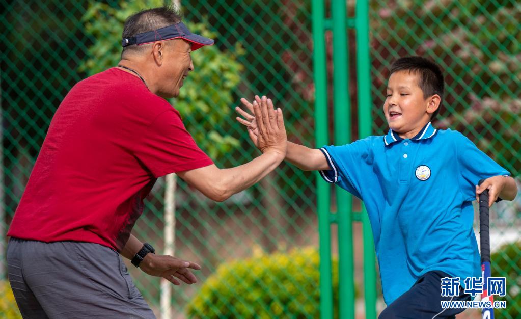 塔城市第二小學(xué)曲棍球隊的小隊員加熱斯·努爾白拉提(右)與教練杜寶柱擊掌慶祝進球(6月11日攝)。