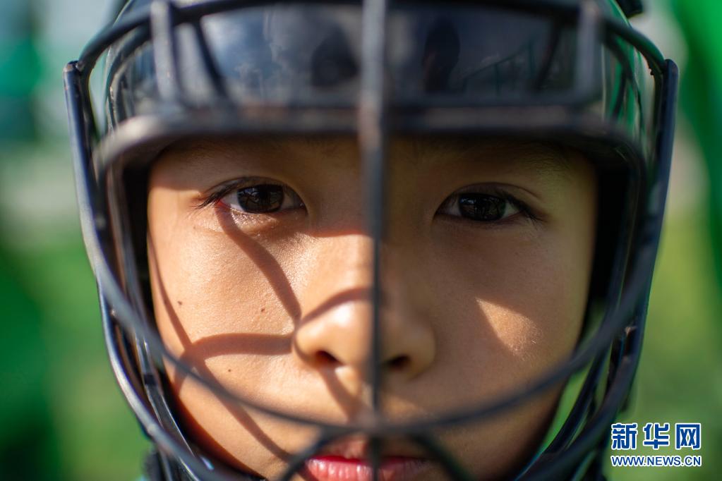 身著護(hù)具的塔城市第二小學(xué)曲棍球隊(duì)員李俊杰在場(chǎng)上擔(dān)任守門員的角色(6月11日攝)。