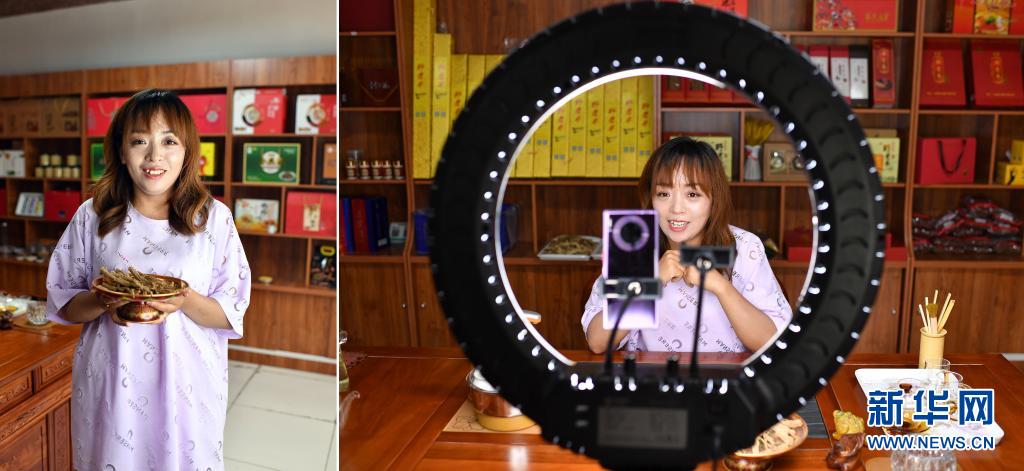 拼版照片:左圖為楊亞飛展示山西省平順縣產(chǎn)的黨參;右圖為楊亞飛通過網(wǎng)絡(luò)直播介紹黨參(7月9日攝)。今年31歲的楊亞飛是平順縣白家莊村人,2013年,懷著發(fā)展電子商務(wù)的夢想,楊亞飛回到家鄉(xiāng)做起了電商。從只有幾件商品,到上線100多種農(nóng)副產(chǎn)品,楊亞飛創(chuàng)辦的網(wǎng)店從無到有,逐漸壯大。借助網(wǎng)絡(luò)的力量,楊亞飛銷售的核桃、花椒、黨參、柿餅、黑棗等當(dāng)?shù)赝撂禺a(chǎn)賣到了全國各地。