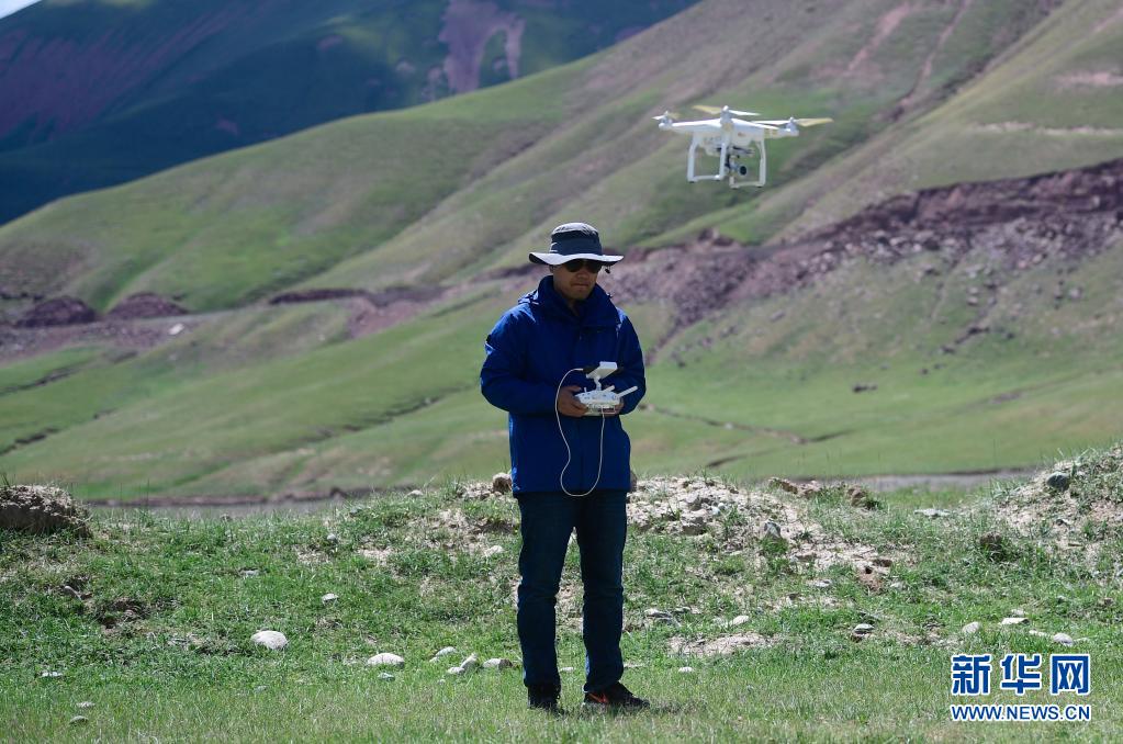 2021年長江源綜合科考的科考隊員趙保成在使用無人機觀測長江源地區(qū)生態(tài)環(huán)境(7月24日攝)。