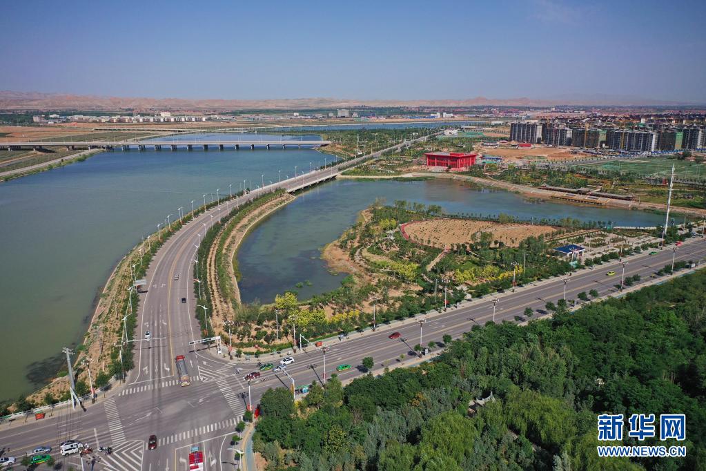 環(huán)繞著寧夏吳忠市同心縣縣城的清水河水系(6月22日攝,無人機照片)。新華社記者 王鵬 攝