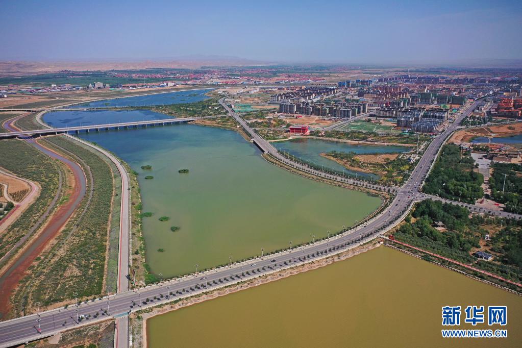環(huán)繞著寧夏吳忠市同心縣縣城的清水河水系(6月22日攝,無人機(jī)照片)。新華社記者 王鵬 攝