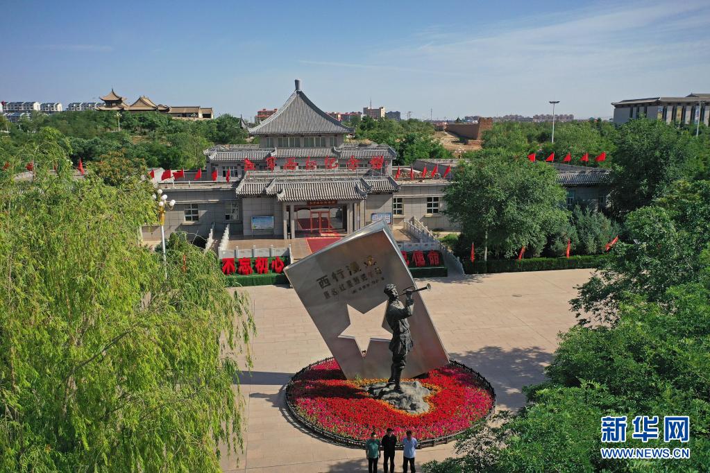 寧夏吳忠市同心縣紅軍西征紀(jì)念館前的“抗戰(zhàn)之聲”小號手雕塑(6月22日攝,無人機照片)。新華社記者 王鵬 攝
