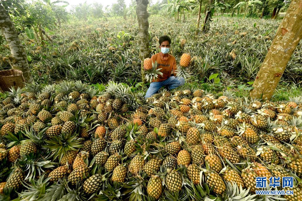 7月25日,一名男子在孟加拉國坦蓋爾展示收獲的菠蘿。