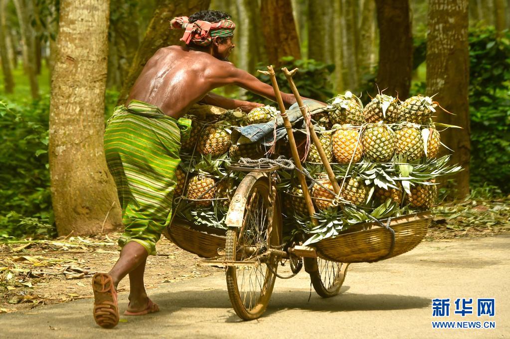 7月25日,農(nóng)民在孟加拉國坦蓋爾運(yùn)輸收獲的菠蘿。