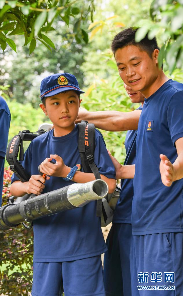 在四川省森林消防總隊特勤大隊,消防員王波平帶著一名孩子在體驗風力滅火機(7月27日攝)。