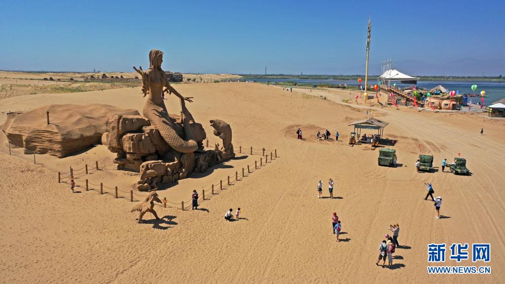 這是7月31日拍攝的寧夏沙湖景區(qū)內的巨型沙雕景觀(無人機照片)。