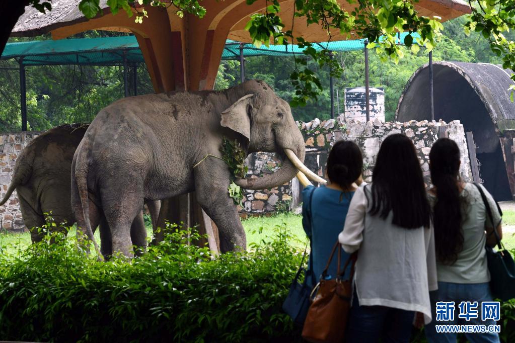 8月1日,游客在印度新德里動(dòng)物園觀賞大象。