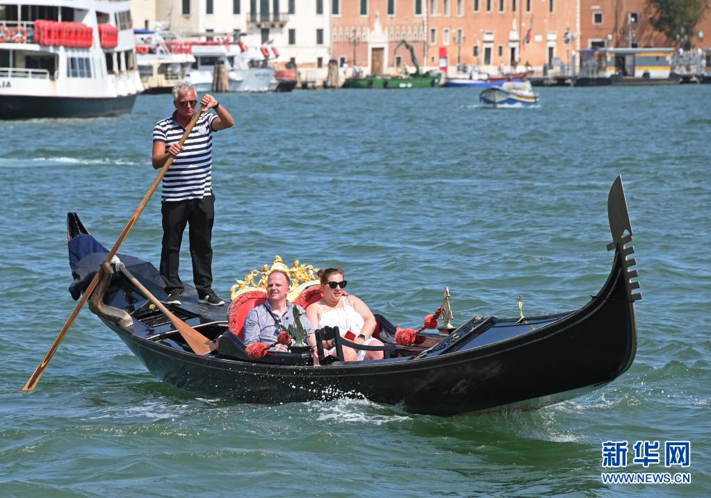 8月3日,游客乘坐“貢多拉”船游覽意大利威尼斯。