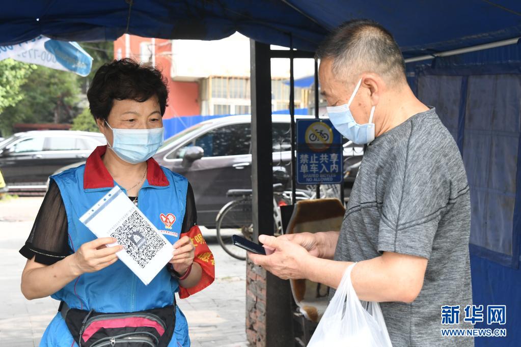 在北京市海淀區(qū)薊門里社區(qū)出入口,董星梅(左)指導(dǎo)進(jìn)入社區(qū)的人員掃描健康寶(8月11日攝)。