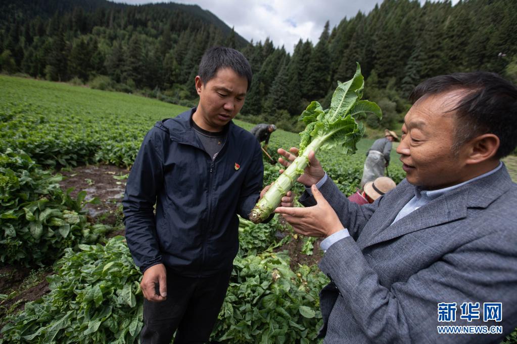 8月13日,在四川省阿壩藏族羌族自治州紅原縣刷經(jīng)寺鎮(zhèn)加當(dāng)村,農(nóng)業(yè)技術(shù)推廣研究員茍俊(前右)在查看收獲的萵筍生長情況。