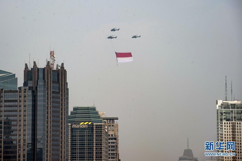 8月17日,懸掛印度尼西亞國旗的直升機飛過雅加達上空。8月17日是印度尼西亞獨立日。新華社發(fā)(維里攝)